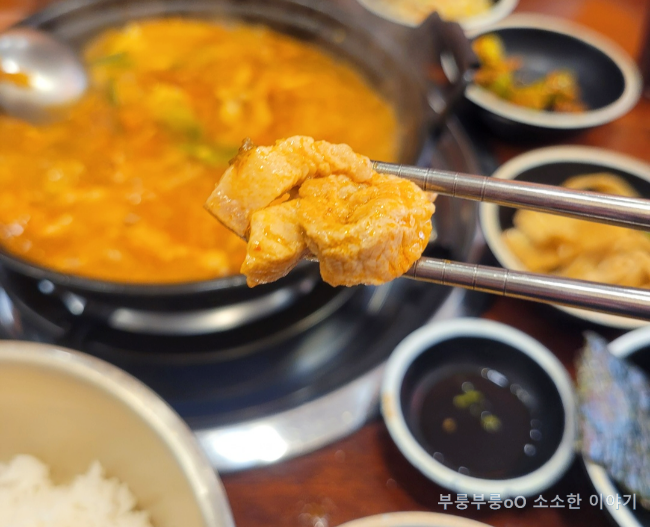 고기를 잘못 쓰면 양념이 강한 찌개를 끓여도 고기 냄새가 나기 마련인데 "열평집밥김치찌개"의 돼지고기는 냄새가 나지 않고, 한 입에 딱 들어갈 정도의 알맞은 크기였다.