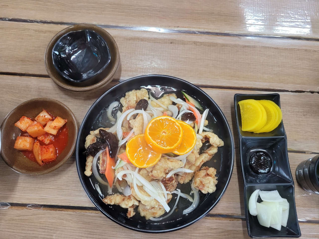 여하튼 오픈 시간에 맞추어 들어갔고, 우리는 "엄블랑 해물짬뽕"과 "엄블랑 감귤 탕수육 小"를 주문했다. 후기에 양이 워낙 많다고도 했고, 밥도 셀프도 가져다 먹을 수 있었기 때문에 욕심부리지 않고 두 가지만 주문했다.